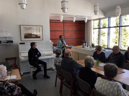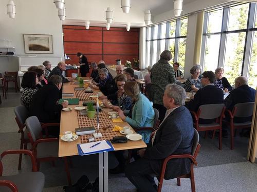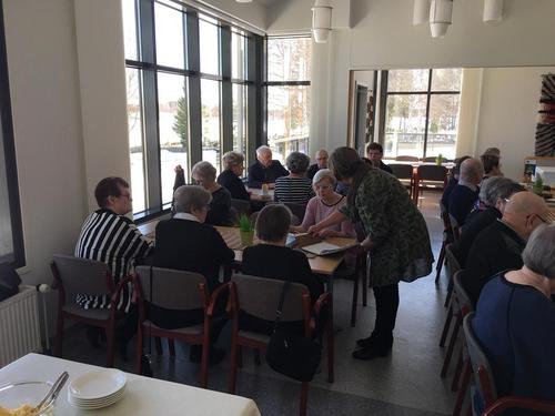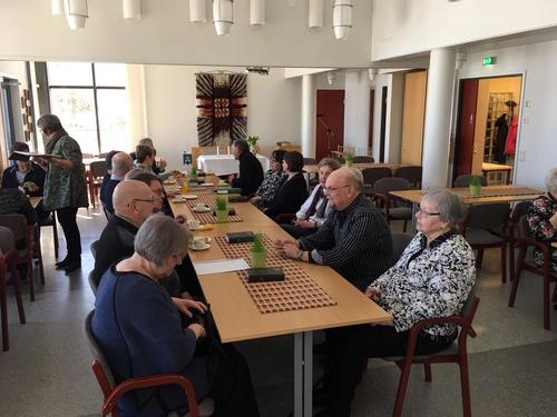 Hiljentyminen Pääsiäiseen vietettiin jälleen perinteisesti Kirkontuvalla. Puh.johtaja Reijo Ojanen avasi tilaisuuden ja toivotti seurakunnan edustajat seurakuntapastorin Ann-Mari Häggman-Niemen ja kanttori Ismo Pitkäsen sekä seniorit tervetulleeksi tilaisuuteen. Puh.johtaja ilmoitti, että pidettäisiin aluksi hiljainen hetki ja sytytettäisiin kynttilät kolmen jäsenemme muistoksi jotka olivat pois nukkuneet viimeisen vuoden aikana. Ismo Pitkäsen johdolla ja säestyksellä veisattiin useita Pääsiäiseen liittyviä virsiä. Ann-Mari Häggman kertoi Palmusunnuntaista ja pääsiäisestä sekä piti vielä lopuksi loppurukouksen. Vielä lopuksi veisattiin Soi kunniksi luojan virsi.