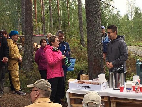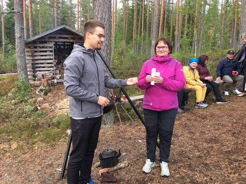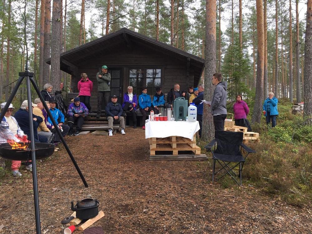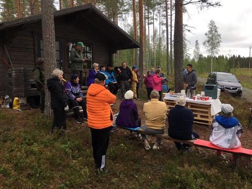 Syyskausi käynnistyi reippaissa merkeissä Luoma-ahon Hattukallion upeissa maisemissa. Sääkin suosi meitä joskin pilvisenä mutta sateettomana. Seniorit olivat lähteneet suurella joukolla ulkoilemaan. Seija ja Tapani Hänninen tarjosivat kokoontumiselle hienot puitteet. Tapani viritti tulet makkaran grillausta varten ja keitti sekä tarjoili senioreille nokipannu kahvia possumunkkien kera. Ennen kävelylenkille lähtöä saimme kuulla Alajärven Apteekin edustajan Arttu Kallion kertomana ajankohtaista liikuntaan liittyvistä asioista mm. liikuntareseptistä ja lisäaikaa liikunnalle-kampanjasta. Lisäksi Arttu Kertoi CardioSignal-älypuhelin sovelluksesta, jolla pyritään havaitsemaan sydämen eteisvärinä. Kiitoksena Apteekille tuesta seniorit antoivat Artulle komeat villasukat viileneviä syysiltoja varten. Seija Hänninen oli järjestänyt pienen arvauskilpailun näin syksyn teemaan liittyen. Lasipurkiin oli kerätty puolukoita ja piti arvata kuinka monta puolukkaa on lasipurkissa. Lähimmäksi puolukoiden määrän arvasi Irma Takapuro jolle Arttu Kallio luovutti Apteekin lahjoittaman tuotepalkinnon.